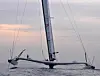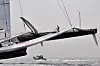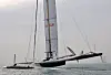 Den var mildt sagt spektakulær, BMW Oracle's USA-17 som debuterte med vingmasten på plass i Valencia igår. Som det fremgår av bildene kan masten tiltes 15 grader mot lo. Det betyr at den innenfor trimaranens nomale krengningsområde vil kunne stå vertikalt. I den lette brisen på rundt syv knop registrerte fotografen som kjørte parallelt ca 22 knop i loggen. Han sier ikke noe om kryssvinkelen, men den var liten nok til å imponere. Det ble registrert 12 personer ombord under testseilingen, mens det i selve America´s Cup seilasen trolig blir åtte mann ombord.