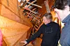 HOVEBILDET: Ulf Andersen viser Will Stirling restaureringen av 10mR «Ghost» og forklarer hvorfor de har brukt furu i områder med fare for frost.