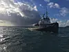SLEP: Her ankommer restene av trimaranen byen Vigo i Spania bak en slepebåt. Dette er bildet banken bruker i pressemeldingen.
