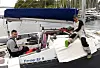 VEL I HAVN: Skipper Adam Price (til venstre) og makker Mikkel Berger inspiserer trimaranen etter ankomst Herdlevågen. Båten fikk litt juling etter rundkastet i kulingbygene, men skadene så ikke omfattende ut.