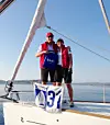 og Ole Sigurd Bratteli om bord i vinnerbåten i klasse B, en Oceanis 45.