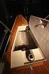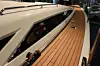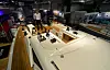 – Dette er jo mer som et hjem enn en båt, kommenterer en svensk dame som besøker båten. Den er for charter, og da ønsker man en renere og og mer minimalistisk stil, forklarer mannen. Det er gøy å lytte på kommentarene. Det svenske publikum er konservative, og liker mahoganyen best. Båten som er utstilt er bestilt av en svensk kjøper på østkysten. Han har valgt lys eik, men båten kan også leveres med innredning i teak.