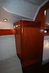 Byssa tar mye plass, men skuffer meg. Byssas sterke side er at den har to vasker og en skikkelig komfyr. Kjøleboksen er også stor. Det som mangler er stueplass. Her er det lite plass til bestikk og tørrmat. I byssa finnes ingen skuffer. Toalettet er stort, større en på trelugars versjonen av Oceanis 37.