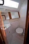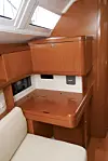 REDERLUGAR: De fleste redere som eier en Oceanis 37, vil nok velge seg lugaren forut. Den er definitivt rommelig. Skottet er trukket akterover, og dette har gitt plass til en liten pult – noen vil si et sminkebord. Det er dessuten bra med praktisk stue­plass, noe det er litt snaut med i de to lugarene akter.