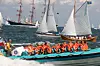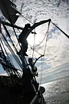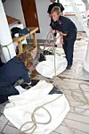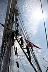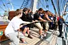 HAL OG DRA:... Alle mann og kvinner på dekk når alle seil skal opp. Foto t.h: «Tre kronor» og «Alexander von Humboldt» i lo.