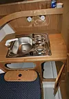 På styrbord side, mellom sofabenken og forpiggen er det montert et toalett som til vanlig dekkes over av en bordplate. Man skal riktgnok kjenne hverandre bedre enn «godt» for fristes til å bruke toalettet mens det er andre under dekk, men det er så absolutt brukbart når man ikke har andre alternativer.