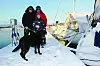 SER ETTER BÅTEN: Erika Ulvemark, Elisabeth Brink, Stina Brink og hunden Goy tar runden langs bryggen og ser ettter båtene.