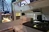 Også under dekk er det kontraster mellom det røffe og det elegante. Det er ikke gjort nye skjul på at det er en metallkonstruksjon under dekk heller. Du kan se hvordan båtens struktur er bygget opp. Det er mer plass enn hva som er vanlig i en dagseiler på 8,5 meter. Det er mulig å sove to stykker, samt en liten bysse. Det er wc, men ikke i eget rom.