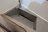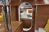 Senterskroget er dypt, og dørken er senket lavt i forhold til salongen som er ett trinn opp. Innredningen er gjort i alm.