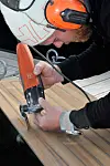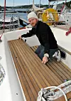 Store bildet: Båtsnekker Jostein Weum tilpasser Kebony-platene levert fra Sandøy Båtdekk