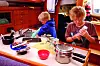 BYSSEMINNER: De beste båtminner starter ofte i byssa. Her serverer Anne Sjersted «flæskestej» i LULUBELLE. Gjett om DET smakte en sen novemberkveld i Sandspollen, med noen «tots» of Highland Park under stjernene i forkant!