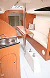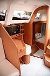 Cockpitløsningen virker fornuftig, med to rorkulter, som i Sun Fast 3200, og løygangen bak, men storseilsjusteringen foran. Genuaskinnen sitter på hyttedekk, og båten har fire vinsjer. Den har også doble akerstag. Den kan leveres med karbonmast.