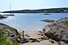 Det beste ved Håholmene er strendene. Her er det en bukt med ekte skjellsand av beste kvalitet. Langrundt og fristene. Det gir vannet en eksotisk grønn farge også. Det er kun noen få brennmaneter å se også, men det kan kanskje komme. Antallet var langt flere på svenskekysten hvor jeg seilte i forrige uke. Disse vil nok drive med strømmen over på Sørlandet eter hvert.