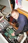 Tom Osa som selger Kiwiprop skal hjelpe til å justere stigningen neste gang båten går på land. Han forteller at med litt tung stigning vil jeg få bedre fart på lavere turtall, men miste litt på maks turtall.