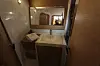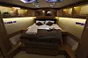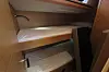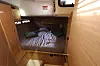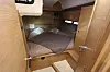 Man kommer altså rett ned i salongen fra cockpiten. Under dørken er det for øvrig en stor vinkjeller. Båten har to akterkabiner. Den utstilte båten hadde bad i tilknytning til babord akterkabin. På styrbord var det en lugar med overkøye og underkøye, som sannsynligvis er populære i åpen sjø. Alternativt kan man velge bad eller våtrom her.