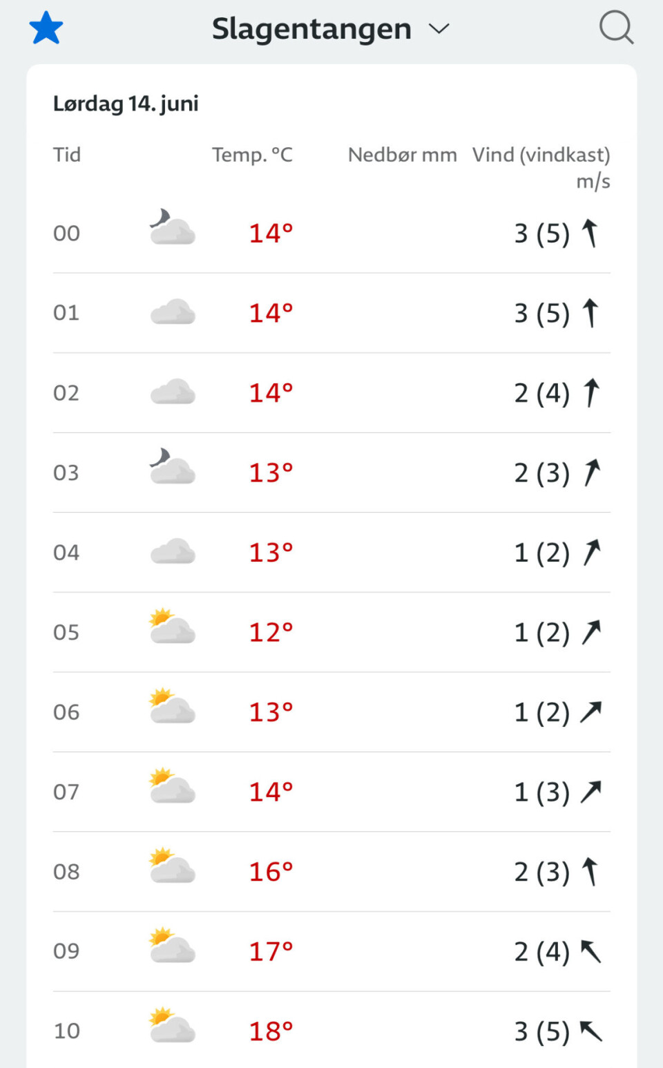 Det er meldt svært lite vind fredag morgen. Den kommer først midt på dagen, og vil vare utover kvelden. Natt til lørdag og lørdag morgen blir det lett vind, og nok av parkeringsplasser. Først ut over lørdag morgen kommer vinden tilbake, fra sør.
