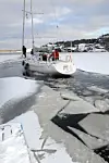 Vi seilte fra Kungsviken på Orust til Käringöen lørdag 4. Desember, videre til Skjärhamn søndag 5. Desember, etter å ha sovet i båten siden fredag kveld. For å komme ut til åpent vann i Kungsviken trengte vi hjelp av Sjöredningen på grunn av den tykke isen. Det er første gang lokalbefolkingen har opplevd is før jul ved Orust, og i år så tykk at man kan gå på den. Isen sliter vekk bunnstoffet langs vannlinjen. Den kan også skade propellen, men tar man det forsiktig, går det bra.