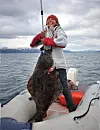 RUGG: Miriam viser fram storkveita på 25 kg. Den måtte lempes i jolla da det ikke var plass andre steder.