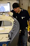 – Polysetersparkel må herde i mange dager før vi kan legge på folie, ellers vil folien smelte. Formen må være bra, men det er ikke noe nødvendig med høyglans før vi legger folien. Den er tynn, så ujevnheter syns igjennom, forteller Daniel S Zielinski som er en mester på å få folien til å ligge pent. Fra start til slutt var båten blitt ny i løpet av to timer. En slik jobb vil vanligvis koste 4 500 kroner, men eieren hadde valgt en kostbar folie til 560 kroner løpemeteren.