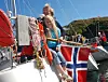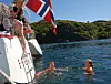 Verken Tora eller de andre i famlien har noe i mot å bade på frivillig basis, og var snare til å hoppe uti det 14 grader varme vannet da båten lå klappet til kai ved Knarren etter målgang. Den eneste som ikke var helt overbevist var pappa Morten, som likevel ikke ville skuffe jentene og dermed lot seg overtale til å prøve det våte element.