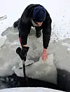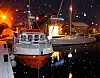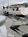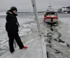 Båten lå helt fast i isen og lot seg ikke rikke. Lørdag morgen fikk vi hugget løs noen biter, og isen var opp mot 20 cm. For å komme oss ut i åpen sjø fikk vi hjelp av Sjøredningen til å lage råk ut fra Kungsviken.