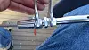 TRE: Etter at vaieren er kuttet, træs enden av terminalen over vaieren. Ikke skru terminalen helt fra hverandre, men løsne godt opp og skyv vaieren inn mellom klemmestykkene før terminalen demonteres.