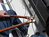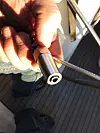 FORSIKTIG: Den andre delen av terminalen (øye, krok, strekkfisk eller gaffel) skrus forsiktig over det hele. Skru denne andre delen rundt mens den første står stille. På denne måten forskyver ikke vaieren seg.