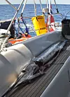 LANG FISK: En Blue Marlin på ca. 30 kilo. Den var like lang som vår cockpit på AVVENTURA (en Dufour 38 Classic). Den ble bedøvet med sprit før den kom seg om bord.