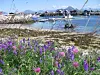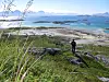 Vi velger en lettere turløype, nemlig den som går rundt skolen og langs Bolgetinden ned til gapahauken og de hvite strendene på yttersia. Her er det helt lunt, selv om det blåser godt på og sjøen går hvitt på innsiden av øya. Her ligger også øyas andre naturattraksjon ved siden av Bolgabørra; nemlig den store Ruggesteinen.
