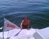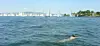 Den rekorstore Færderflåten på nesten 1200 båter er nå på vei ut fjorden. Men ikke alle er opptatt av seiling i det fine været. Langs fjorden er det et yrende badeliv og båtliv. Vårt reportasjeteam har fanget inn bildet av denne kvinnen som er ute og svømmer i det Færderflåten kommer.