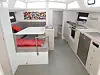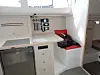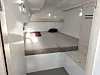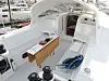 Det er mye lys og utsikt fra salongen. Byssa er langsgående med kartbordet i bakkant. Den utstilte båten har to akterlugarer.