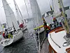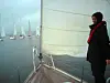 Båten er logirig og trekker opp mot vinden. Akterstaget var strammet for å motvirke dette, men likevel var den logirig. Vi nærmet oss og så trakk baugen opp mot vinden, slakket så litt på genuaen og fikk igjen kontroll på båten og fikk styrt inn mot land. Såå trakk baugen igjen opp mot vinden og vi fortsatte vår prosedyre. Dette holdt vi på med halvannen time, uten at vi kom inn. Linn hadde ringt mannen sin Ørjan som sto på brygga og så på oss, klare med tepper, varme baguetter og som var kjøpt for anlendingen, og klart til å ta i mot tau og trosser.