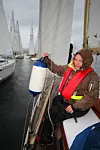 MAGISK: Stemningen i Drøbaksundet var flott, selv med regn og motstrøm! Her er en fornøyd Tirill Mohn til rors i «Animara» i ferd med å passere flere stilleliggende båter.