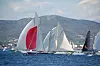 HOVEDBILDE: Mange flotte seilbåter vil det bli å se utenfor den franske byen St. Tropez denne uken. Den blå båten i forgrunnen er en 12 mR-båt. Den illustrerer hvor store de største yachtene er. Båten med D i seilet er en 15 meter og ketchen en 23-meter. Fra Saint-Tropezregattaen 2010. Foto H. Nissen-Lie.