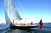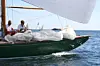 Med kronprins Haakon som fordekksgast var Kong Harald først i mål under åpningsseilasen på Risør Trebåtfestival.
