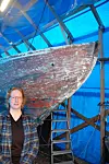 METTE OG BÅTEN: Mette Lund foran A 116 inne i telthallen i Sandefjord der hun restaurerer den 83 år gamle spissgatteren.