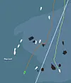 De første båtene nærmer seg stillebeltet. Å finne den riktige veien gjennom vil være avgjørende på resultatlisten de kommende dager. Loick Peyron ligger lengst vest av de tre første, noe som var best når Volvo Ocean Race båtene var i samme område for noen uker siden.