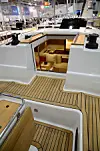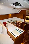 Elan 494 kan leveres i hele ni ulike innredningsalternativer, fra to til fem lugarer. Men alle har salongen plassert bak byssa. Båten på utstillingen er tilpasset charter.