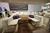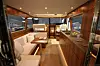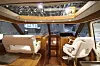 Båten har en stor badeplattform og en hekkgarasje med enorm plass. Over hekkgarasjen er utesalongen, som fortsetter i samme plan innover i båtens salong. Her er innredningen nokså klassisk med salong på babord og bysse på styrbord, og deretter førerplass med utgangsdør til dekke. Dollbordene er usedvanlig brede og skansekledningen høy som på et skip.
