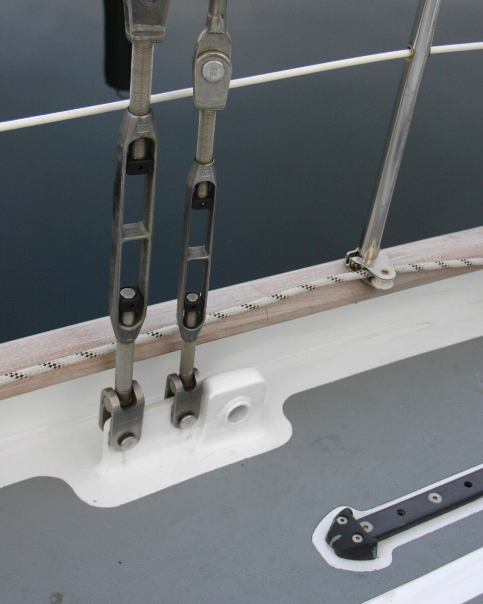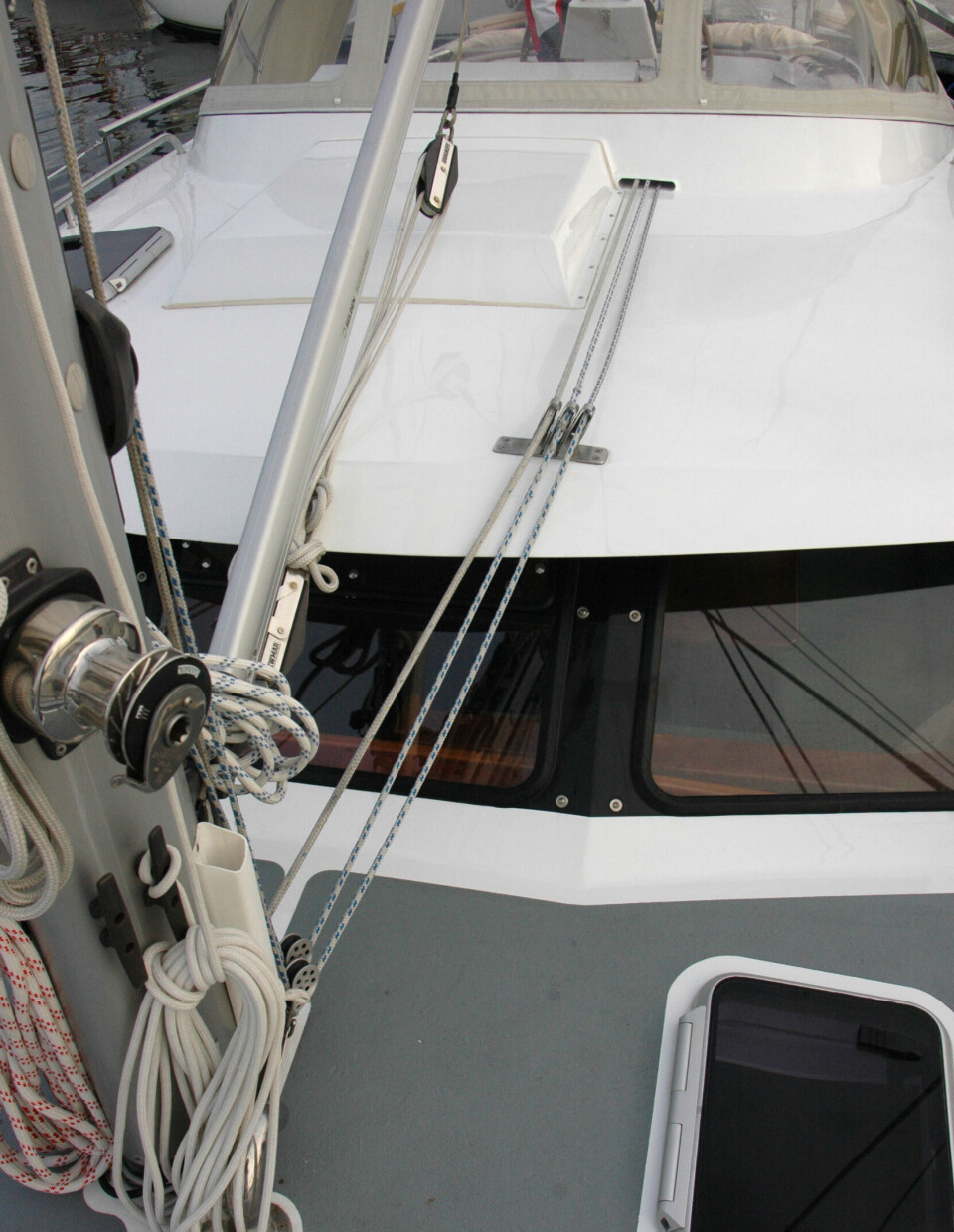Seldén, sølveloksert aluminium. Dobbel saling. Storseil med vertikale spiler på rull i mast og genua på rullestag. Rodkick. Andersen vinsjer 2x52 ST – 1x40ST – 2x46ST Elvström Sobstad Offshore seil Storseil – Genua