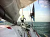 – Nå er vi kommet over bukta fra Le Havre til Barfleur. Tiden vi har brukt er eksakt iht routingen! Fra start seilte vi med en heavy gennaker. Den ble etterhvert for liten så vi skiftet til den største vi har. Det har blåst jevnt 20 til 25. Vi bruker også den nye spinnakerbommen og braser opp med den. Utrolig effektivt. Vi ser at vi holder jevn fart med de rundt oss, men teten har vel stukket noe. Men det er fortsatt nesten 5000 nm å seile så en kan vel ikke lage den endelige resultatlista ennå... :-), skriver Løvgren og Åsberg i første rapport siden start