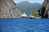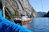 Ikke før var Vagabond ankret opp i bukta innerst i fjorden, før Hurtigruta seg inn. Skipper'n kalte dem opp på VHFen for å forsikre seg om at lille Vagabond ikke lå i veien, men en rolig, lett lattermild, stemme kunne forsikre om at alt var greit. Nordnorge kom inn og snudde "på fem-øringen" mens passasjerene knipset og knipset de stupbratte fjellveggene som reiser seg rundt den idylliske bukta.