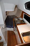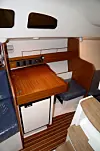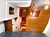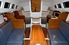 Cockpiten er stor, og X-Yachts har gjort mye for å lage en lett og billig båt. Båten har et lavt fribord, men allikevel så er det fult mulig for en familie å dra på ferie i båten. Planløsningen minner om J/111 som er over en meter lengre. Dørkplatene er lagt så lavt som mulig, noe som gjør at jeg med mine 1,81 akkurat får ståhøyde med sko. Utstillingsbåten er uten køyer forut. Foran hovedskottet er det kun toalett og hengeskap. Salongen er overraskende stor, men et skikkelig bord. Båten har en grei bysse hvor det er plassert et kjøleskap under kartbordet. Byssa er utformet slik at den er enkle å bruke i sjø. Bak byssa og bak kartbordet er det to brede køyer. Det mangler dør, men hva gjør vel det. De færreste ønsker god ventilasjon, og sover med døren åpen. Det er også mulig å utsyre akterlugaren med ekstra rørkøye, noe som gjør at to personer kan sove helt mot lo under havseilasregattaer. En slik rørkøye vil også fungere bra for bagger og utstyr.