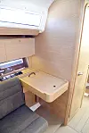 NAVIGASJON: Oceanis 35 har et fast kartbord i enden av salongen. El-panelet er montert vertikalt, som er en fordel. Akter er et lite klesskap.