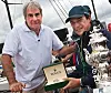 Bildet over: Patrick Boutellier, Rolex Australia, overrekker en Rolex Yachtmaster og Tattersalls Cup til Geoff Boettcher, eieren av «SECRET MENS BUSINESS 3.5», over all vinnereen av årets Sydney Hobart Race.