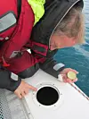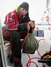 En oppdagelse som ikke var like gunstig var at det er kommet mye vann pontongene etter det dårlige været vi har hatt. Disse er hyppig helt dekket av vann og inspeksjinslukene har vist seg ikke å være 100 pst vanntette. Vi har hatt minst 100 liter uvelkomment vann idem. Vi har nå fått vannet ut og smurt gjengene i lukene med Vaselin. Det håper vi skal hjelpe. Godvær idag har gjort det mulig å tørke soveposene på dekk og få frem solpanelene for å lade batterier.
