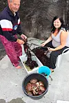 På brygga møter vi far og datter Karl Solheim og svigerdatter Therese Nielsen, som er i ferd med å vikle ut nattens krabbefangst fra garnet.