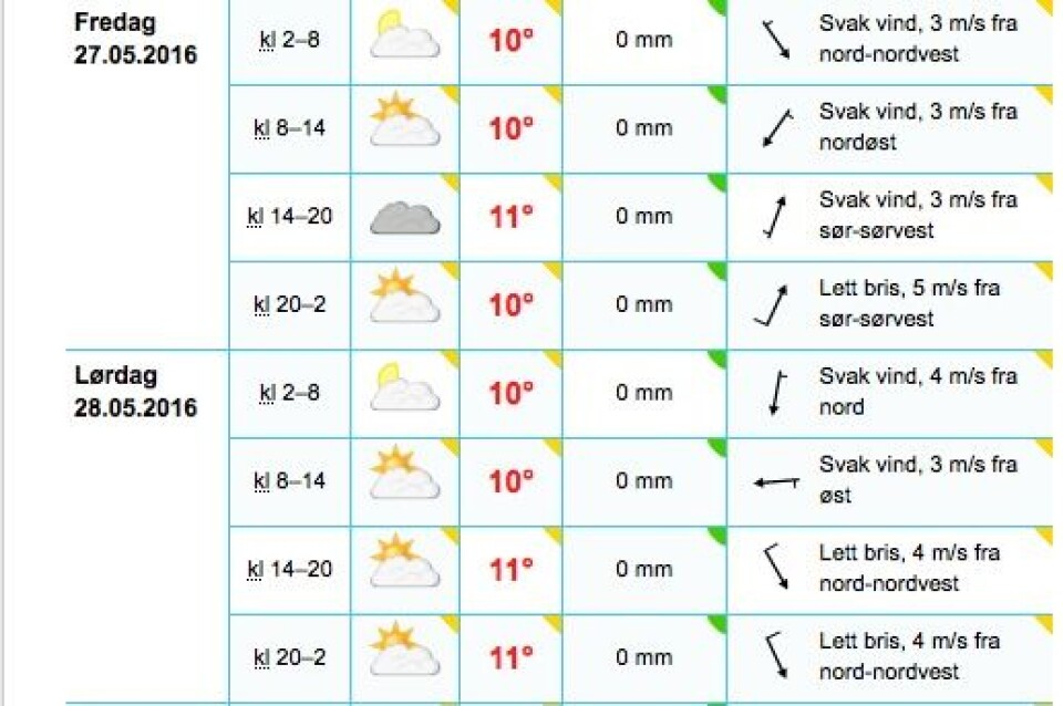 Deltagerne i Seilmakeren Doublehanded ser ut til å kunne legge igjen regntøyet på land denne gangen. Solkrem blir langt viktigere. Yr har ikke en eneste regndråpe i sitt langtidsvarsel på strekningen mellom Askøy og Haugesund, og vinden blir lett og varierende. Man kan nesten snakke om «nordavind fra alle kanter»; vindpilene går i alle retninger gjennom fredag 27. og lørdag 28. mai.