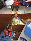 En av skrogventilene hadde en liten lekkasje som hadde lekket en stund. Med en propp i gjennomføringen på yttersiden ble problemet fikset med båten i vannet. Koniske treplugger kommer med andre ord til nytte.