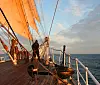 Vi så lyn og torden i sør, og plutselig hørte vi «Eendracht» rapportere at de var blitt truffet av en byge med 40 knop vind. Generalalarm, alle mann på dekk for å berge seil. Bygen traff som en knyttneve, men vi klarte å falle av og ri den av nogenlunde greit. Første waypoint ble passert ved midnatt, rett foran «Statsraad Lehmkuhl« og «Sørlandet». Våre beste venner og argeste konkurrenter.